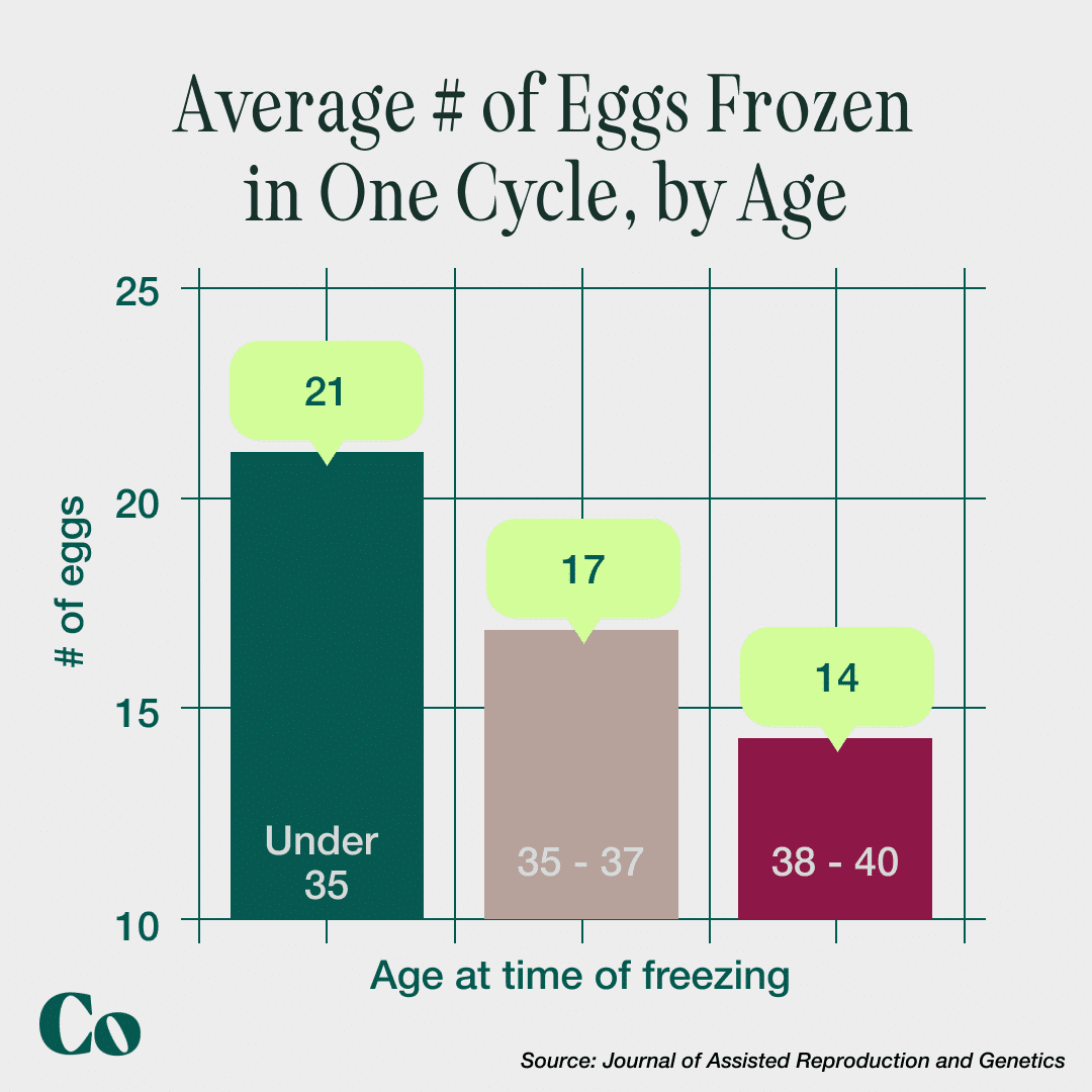 One study of 1,241 women found that the average number of eggs retrieved on the first egg freezing round was 21 eggs for women under 35, 17 eggs for women 35-37, and 14 eggs for women 38-40.