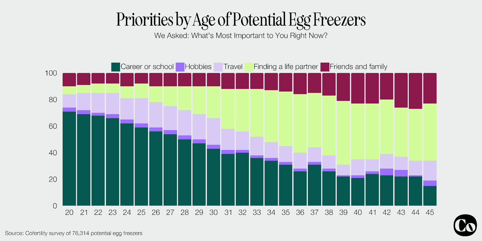 To better understand the motivations of those considering egg freezing, we surveyed over 75,000 women of reproductive age who came to our website to learn more about egg freezing. Our findings revealed distinct trends in what they considered their top priorities, trends that closely mirrored the broader societal shift toward later marriage and parenthood.
